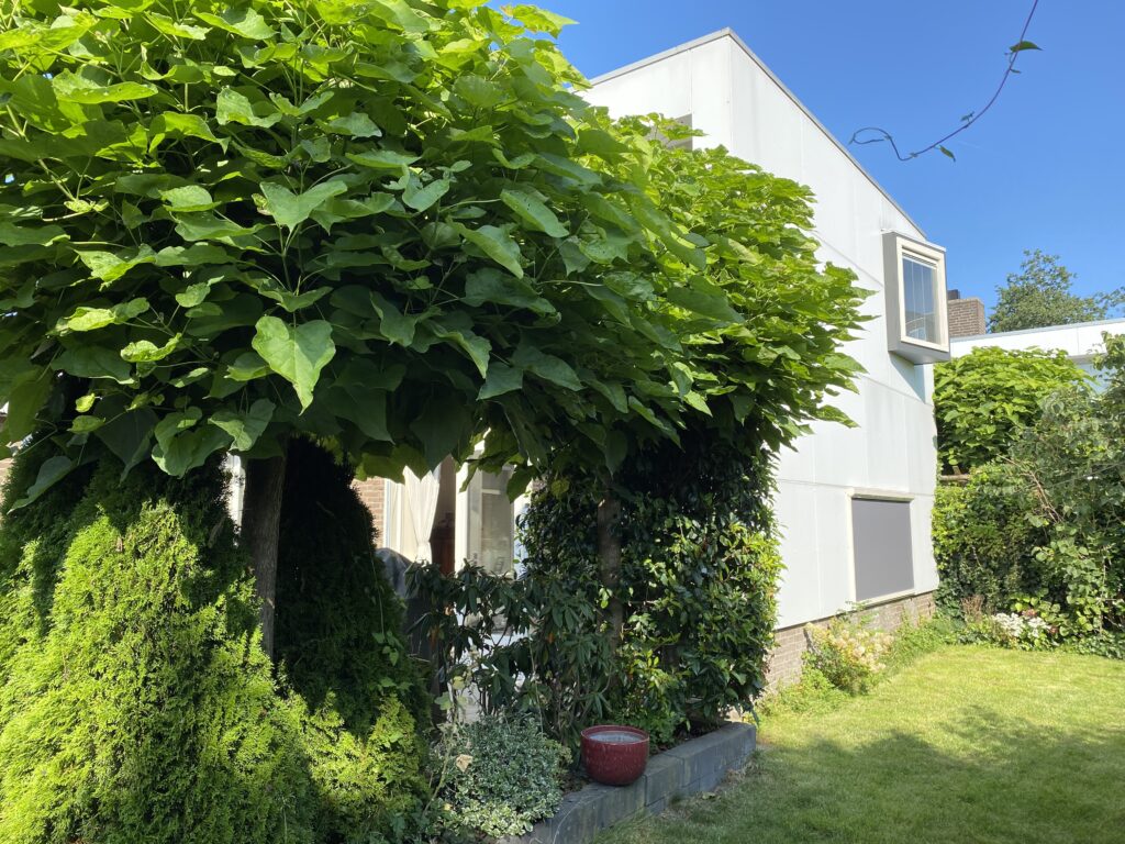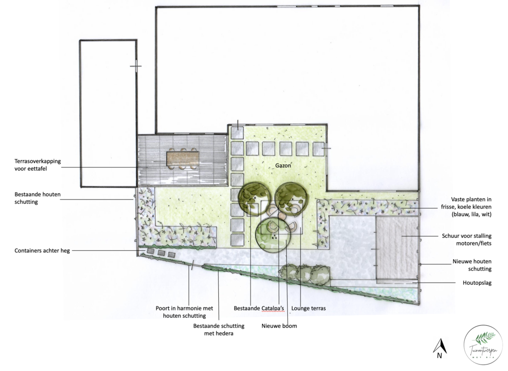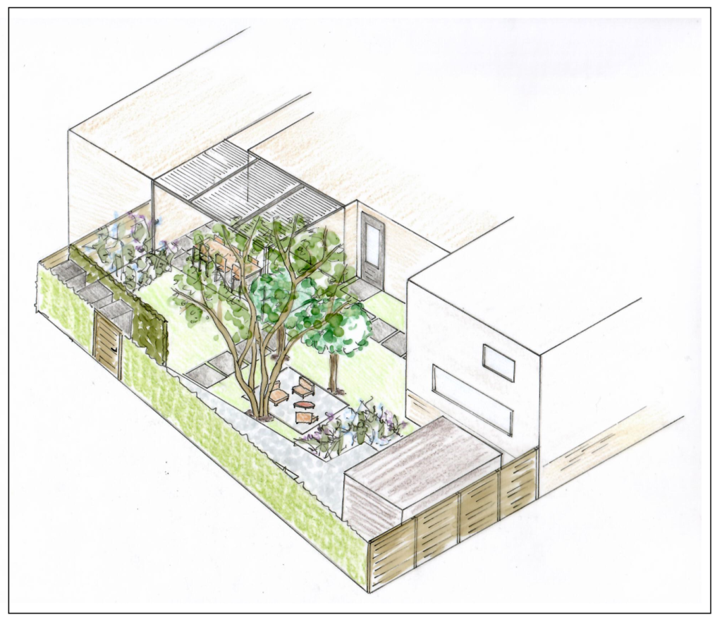 De tuin is omsloten en ligt pal op het zuiden. Daardoor is het in de zomer erg warm. Door een vaste overkapping aan het huis en meer bomen ontstaat een koelere, aangename plek. Meer waterdoorlatende materialen voorkomen plasvorming bij heftige regen.