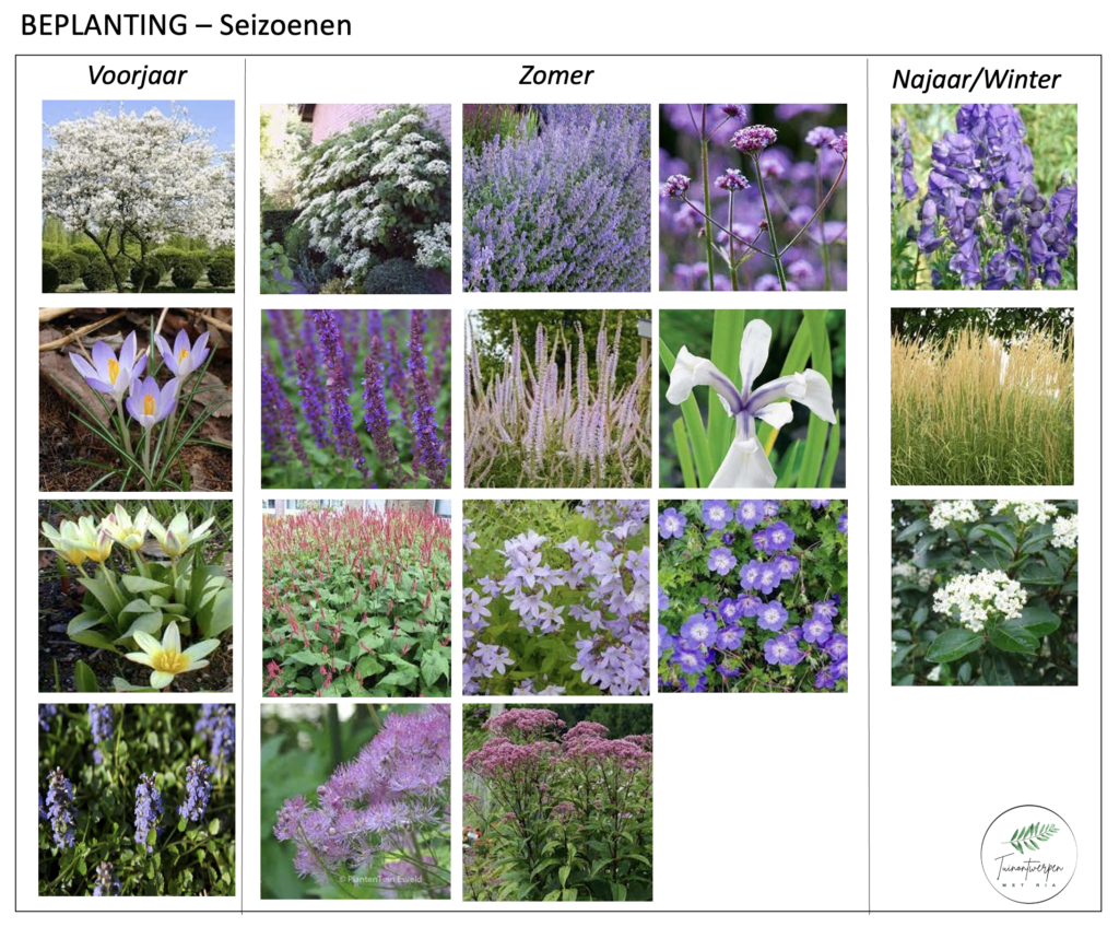 De borders brengen kleur in de tuin. Het is een gemengde border in de kleuren lila/paars/roze/wit. Afgewisseld met koel groen. Bollen zorgen voor kleur in het vroege voorjaar.