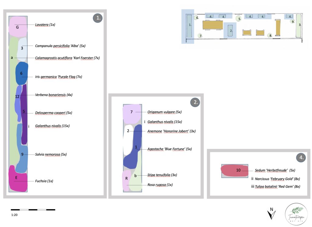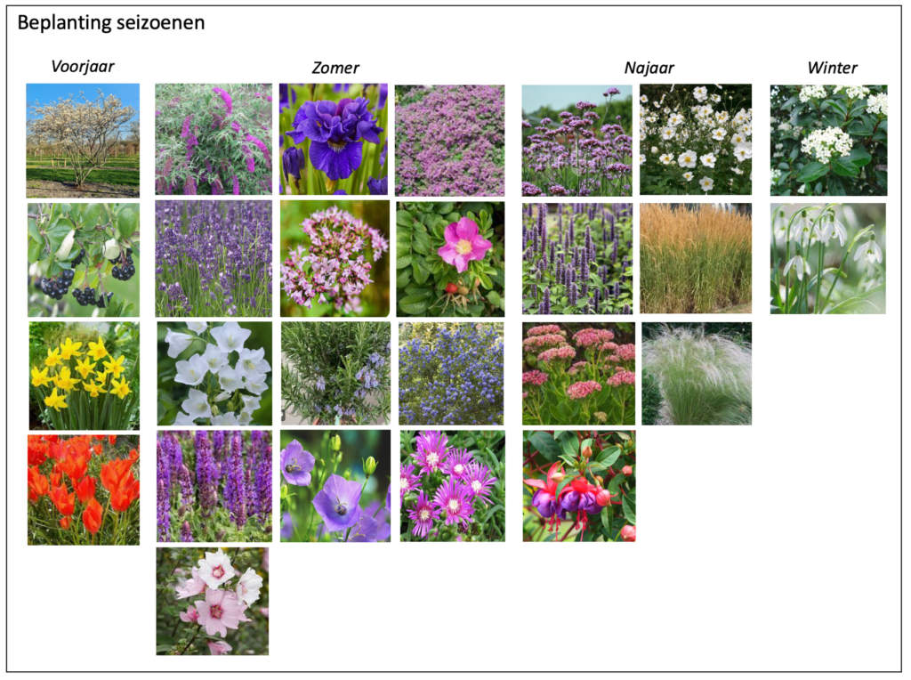 De variatie van planten zorgt voor een levendig geheel. Met bijen-lokkende soorten wordt het ook nog eens een vrolijk gezoem als de planten in bloei staan.
